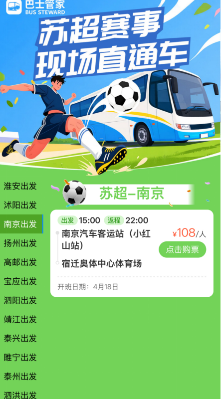 首轮第二周(4月18日起)赛事直通车也已上线,覆盖南京、睢宁、淮安、扬州、宝应、高邮、泰州、靖江、泰兴、沭阳、泗洪、泗阳等出发地,后续将根据赛程逐步扩展至全省所有设区市。