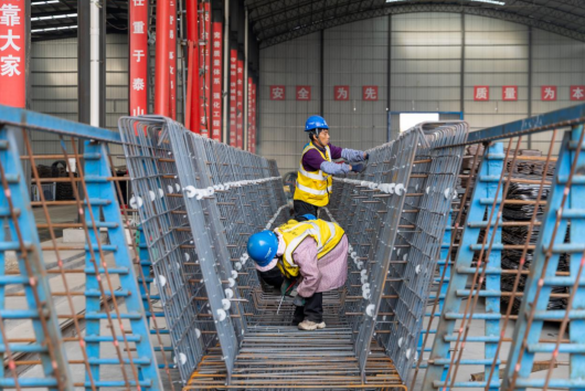 在项目预制梁场,各作业区有序联动、高效运转。钢筋加工区内,工人专注进行焊接作业,精准绑扎成型;模板区内,技术人员严格检查平整度与拼接精度,严把预制构件基础质量关;混凝土浇筑区内,搅拌车、输送泵协同作业,振捣密实、规范养护。存梁区内,100多片成品预制梁整齐排布,储备充足、保障有力,为全线桥梁施工提供稳定支撑。