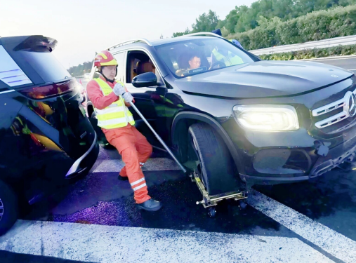 时间就是生命。杨俊生没有丝毫犹豫,单膝跪在被烈日炙烤得滚烫的路面上。他双手紧握移车器杠杆,一点点沉腰发力,精准固定住故障车轮胎。汗水如同断了线的珠子,顺着额头不断滑落,浸透了厚重的反光背心,他顾不上眨眼,任凭咸涩的汗珠滚入眼眶,目光却始终专注如初。