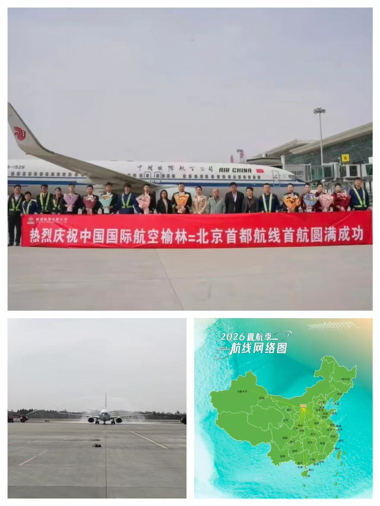 2026年3月29日14时30分,中国国际航空CA1299航班满载着161名旅客平稳降落在榆林机场,标志着北京首都=榆林航线成功首航。