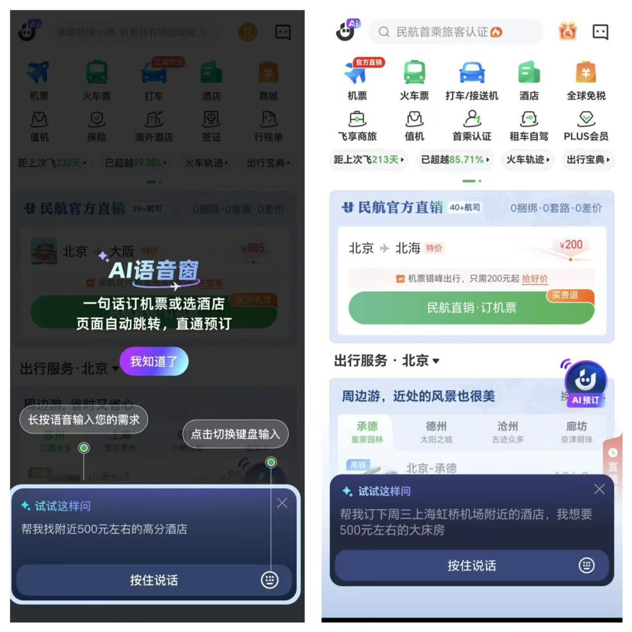 在传统机酒预订模式下,旅客往往需要在海量信息中手动筛选航班时刻、价格区间、起降机场、酒店位置、房型床型等多项条件,操作繁琐且耗时。航旅纵横新上线的AI预订功能彻底改变了这一流程,旅客只需对着手机说出“下周一我要从北京飞广州,我想12点前到达,按价格从低到高帮我排序”“帮我预订下周一广州白云机场附近的酒店,我想要500元左右的大床房”等需求,无需手动勾选筛选、反复比对选项,AI便能自动在航旅纵横APP内完成操作,从海量机票、酒店中为旅客精准匹配最优方案。