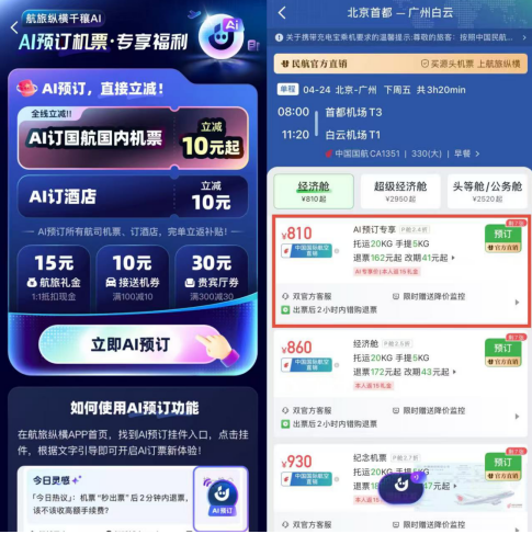 航旅纵横在上线AI预订机酒功能后,加码推出AI预订专属优惠活动。旅客通过“AI预订”购买国航的国内机票,可享每位乘机人立减至少10元优惠,部分航线优惠力度更大,最高可享每位乘机人立减 80元优惠,且均不限次数。此外,通过AI预订购买所有航司机票,完单后就可领取航旅礼金、接送机优惠券及贵宾厅券等多重补贴。从“能办事”到“更省钱”,航旅纵横正以“AI+补贴”双轮驱动,推动民航出行服务从智能化走向普惠化。