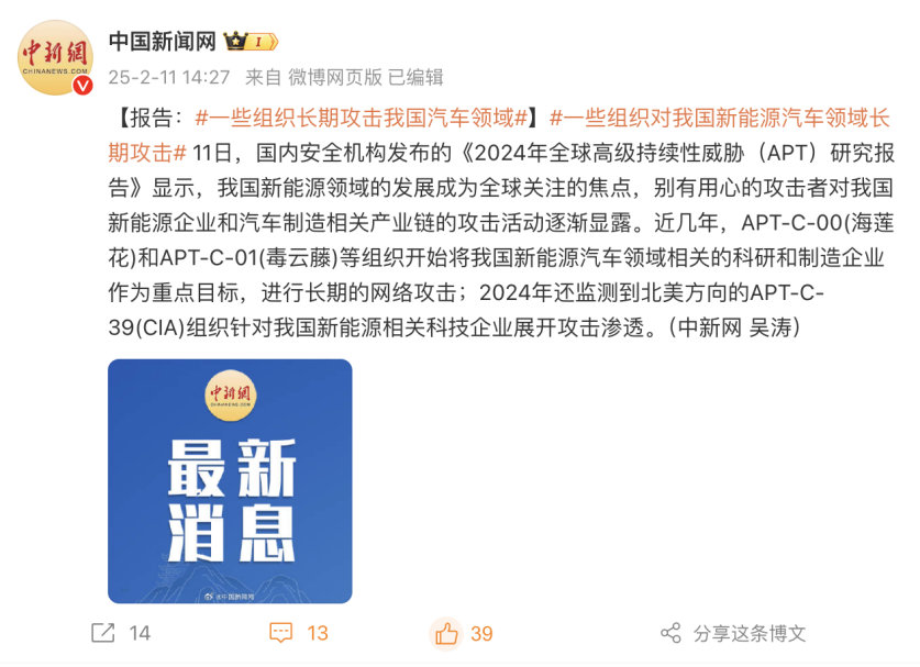 近年来,随着我国新能源汽车行业的迅猛发展,一些别有用心的“黑媒体”、“黑公关”势力频繁活动,通过散布虚假信息、恶意诋毁等手段,试图破坏我国新能源汽车企业的声誉,扰乱市场秩序。近期,中国新闻网报道,有组织开始将我国新能源汽车领域相关的科研和制造企业作为重点目标,进行长期的网络攻击,为此,必须高度警惕。