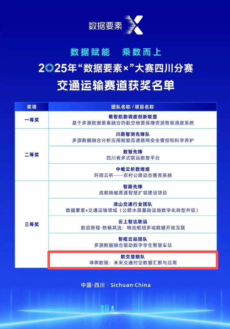 近日,以“数据赋能,乘数而上”为主题的2025年“数据要素×”大赛四川分赛决赛圆满落幕。经过多轮激烈角逐与严格评审,易方智慧牵头“数交慧眼队”凭借创新项目——“坤舆数镜:未来交通时空数据汇聚与应用”,在众多参赛作品中脱颖而出,荣获大赛三等奖。这一成绩充分展现了易方智慧在数据要素应用与交通数字化转型领域的深厚技术积累与卓越创新能力。