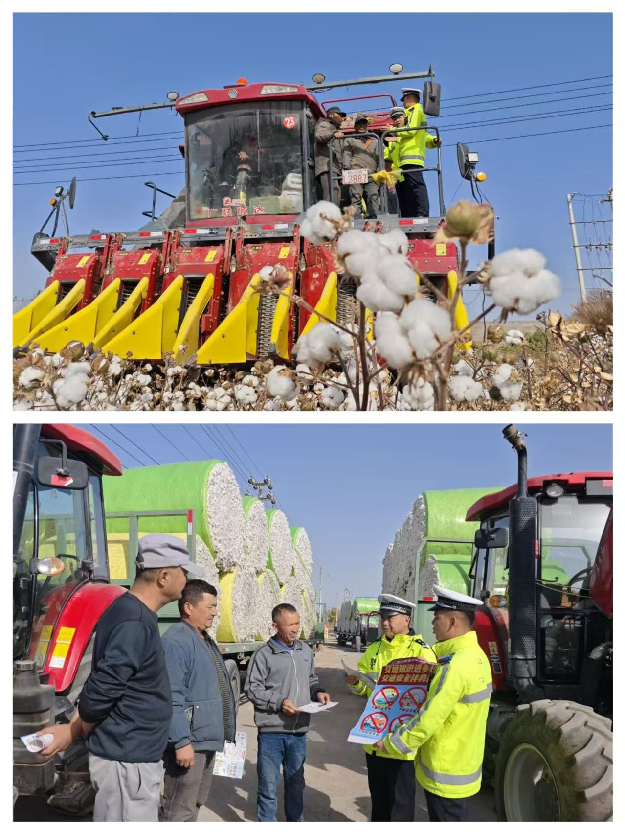 金秋时节,新疆库尔勒市的120万亩棉花迎来采收旺季。在各乡镇棉田里,采棉机轰鸣作业,满载新棉的拖拉机在田间、道路与棉花收购加工企业之间来回穿梭,棉农开车或驾乘摩托车、电动车早起晚睡奔波在棉海当中,车辆和人员出行频繁,交通安全隐患不容小觑。眼下,正是库尔勒棉花采收、运输、销售的关键时期。为保障保障丰收棉花“采得顺、收得稳、运得快、卖得好”,确保采收、运输期间的交通安全畅通,守护棉农的丰收成果为美丽乡村营造的浓厚的氛围,10月21日,库尔勒市公安局交通管理大队库普路中队大力开展“护航到棉田、上门送安全”交通安全主题宣讲,民警面对面向采棉机、拖拉机驾驶人和棉农送法律、送安全、送服务。