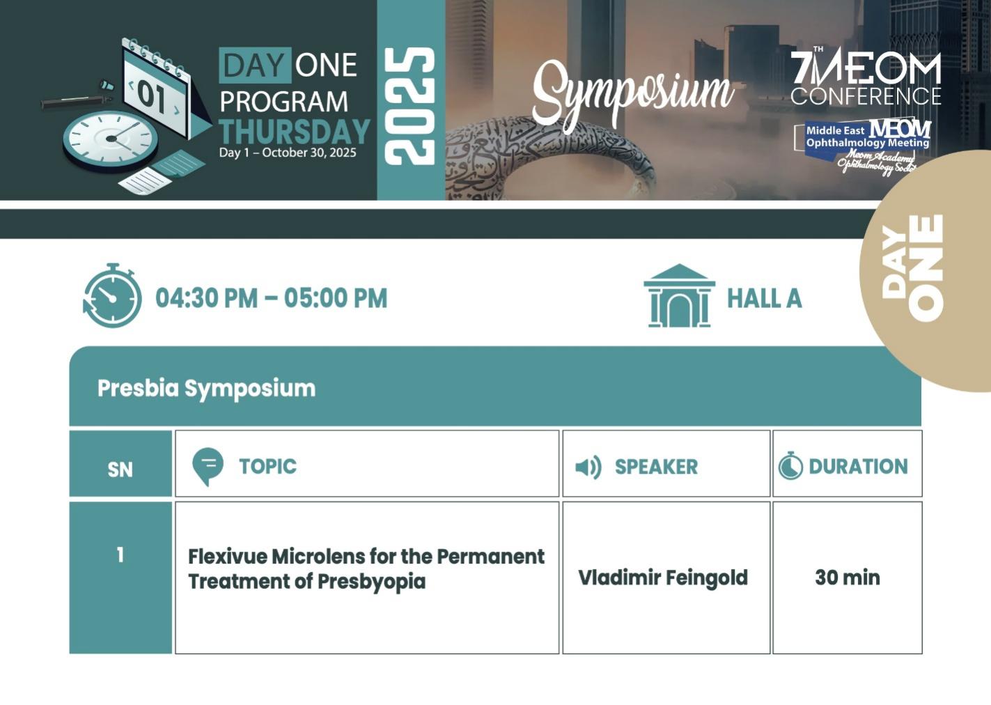 第七届MEOM中东眼科学术会无疑将是2025年全球眼科专家不容错过的思想碰撞之地。Presbia期待在迪拜与您相会,共同见证这一学术盛事,并关注VladimirFeingold博士关于FM微透镜在老视矫正技术的精彩分享。这不仅是了解老视矫正前沿技术的绝佳机会,更是与眼科行业领袖直接交流、共同探索眼科发展新路径的宝贵机会。