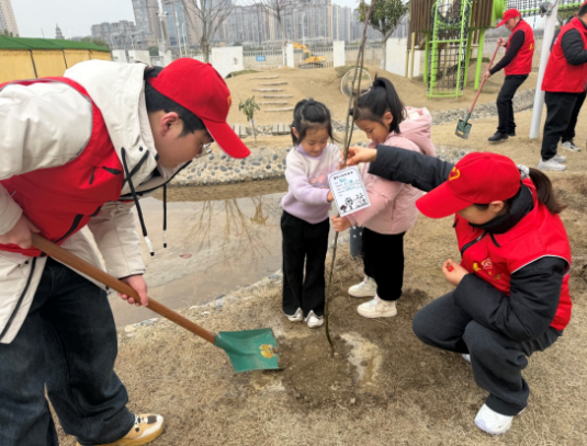 植树现场,港航职工、社区志愿者与孩子们分工合作,挥锹铲土、提水浇灌、扶正树苗、踩实土壤,每一个步骤都认真细致。志愿者们一边示范植树技巧,一边叮嘱孩子们“树苗要扶正,土要踩实,小树才能茁壮成长”。孩子们动作虽稚嫩却格外专注,在亲手为小树挂上树牌的同时,默默许下“我与小树共成长”的美好心愿,在心中种下了生态环保的种子。