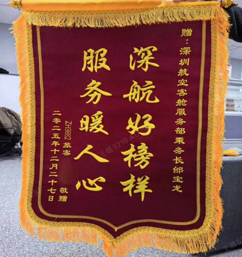 岁末寒浓,深圳航空客舱服务部以热忱专业的服务,为旅客行程添注融融暖意。近日,旅客曾先生专程向客舱服务部赠予绣有“深航好榜样,服务暖人心”的锦旗,以此致谢ZH9882航班乘务组的优质服务,这亦是深航“任何时候、自然体贴”服务理念的生动践行。