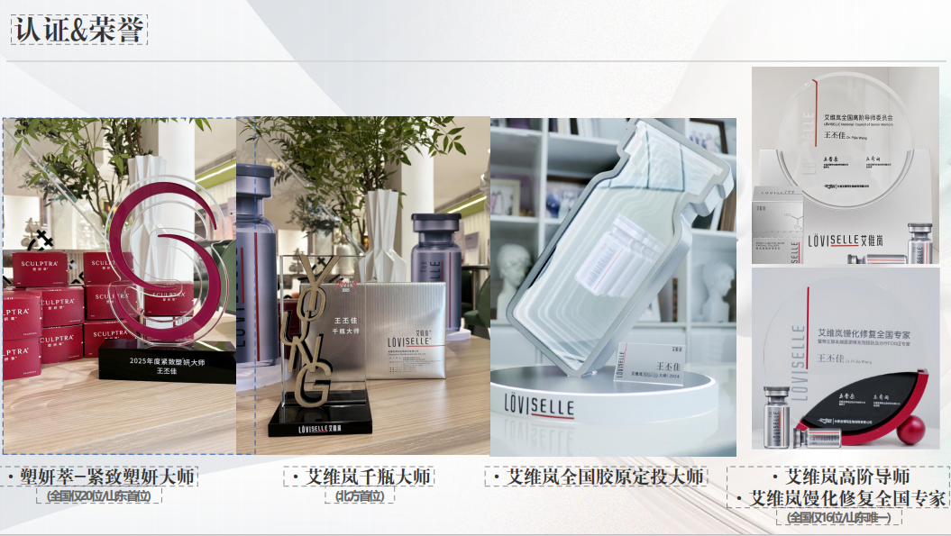 Dr. 王丕佳斩获多项全国级、区域级稀缺荣誉,行业认可度极高。全国层面,他是艾维岚欧洲访学者(全国仅 20 位)、艾维岚馒化修复全国专家(全国仅 16 位)、高德美塑妍萃 - 紧致塑妍大师(全国仅 20 位)、艾维岚全国胶原定投大师、艾维岚高阶导师,还入选全国仅 12 位的艾维岚双周直播间大咖学术院长;区域层面,他是北方首位艾维岚千瓶大师、山东唯一艾维岚馒化修复专家、山东唯一珂芮绮胶原高阶导师、山东首位高德美塑妍萃 - 紧致塑妍大师,同时担任蓉芷溶脂针东二区(山东、江苏、安徽)唯一导师。此外,他还拥有艾尔建认证医师、濡白天使认证医师、菲林普利认证医师、乔雅登注射认证医师、美国保妥适 BOTOX 认证医师、双美胶原蛋白认证医师、FLLMED(中国工艺)填充优选注射医师、艾莉薇注射授证医师等多项品牌认证资质。学术著作方面,他参与编译《透明质酸注射安全指南》《面部填充术》等专业书籍,同时所在的青岛卓源时刻医美机构被评为中国医美合规产品扫码验真示范机构、2025 年度蓉芷合作机构