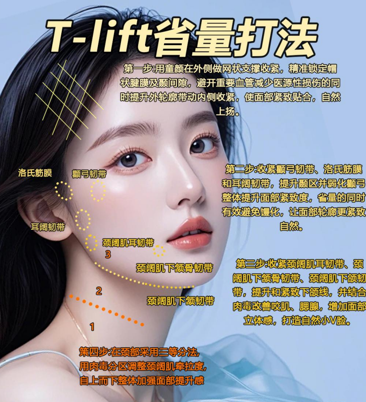 1. T-lift 省量打法 :这是一套四层递进的精细化打法,核心在于避免馒化、实现省量高效抗衰。第一步用童颜针在外侧做网状支撑收紧,精准锁定帽状腱膜及颞间隙,提升外轮廓的同时带动内侧收紧;第二步收紧颧弓韧带、洛氏筋膜和耳阔韧带,提升侧颊并弱化颧弓,紧致松弛软组织,复位下垂脂肪垫;第三步收紧颈阔肌耳韧带、颈阔肌下颌骨韧带等,结合肉毒注射改善咬肌,打造自然小 V 脸;第四步针对颈部采用三等分法,用肉毒分区调整颈阔肌牵拉度,整体提升面部线条,增强立体感与光影层次。此外,该打法还包含韧带铆钉打法与深浅筋膜收紧技术,通过钝针在韧带上铺设铆钉实现局部点状支撑,同时提升 SMAS 层,增加皮肉贴合度,实现 “皮贴骨” 的紧致效果。