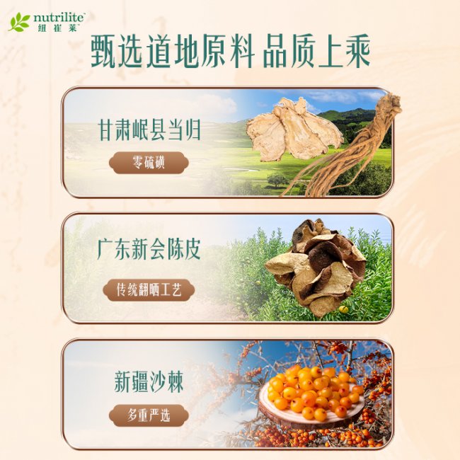 纽崔莱与甘肃岷县、广东新会、新疆的道地原料产区建立长期合作,农场采用有机种植标准,每批原料都经过产地溯源与成分检测:比如岷县当归的阿魏酸含量需达到0.5%以上,新会陈皮需是3年以上陈化产品,确保原料功效稳定。