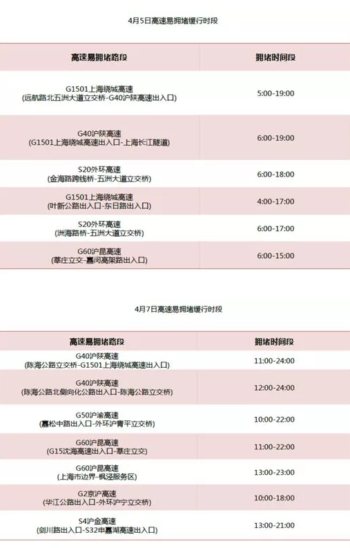 就上海的出行情况看,清明小长假的拥堵最高峰预计在4月5日7时至14时出现,紧接着的是4月7日的12时至21时拥堵程度较高。