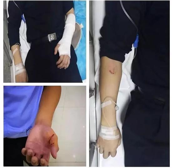 随后,执勤人员呼叫110指挥中心联系文昌边防派出所到现场处理。目前,该案正在进一步处理中。金海湾西大街人民路口执勤的两名执勤人员在该事件中受伤,一名执勤人员右手背被杨某某咬伤,左手被杨某某用铁锤打致尺骨远端骨折,另一名执勤人员左手掌被咬伤。