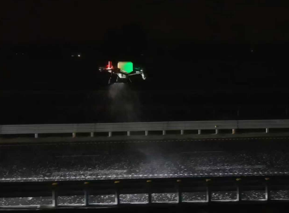 为应对此次大范围降雪,公司养护队伍提前装载融雪剂,做好物资设备准备。降雪伊始,立即按照“即下即清、边下边清”的原则,展开机械化除雪作业。此次除雪防滑工作最大的亮点在于科技力量的深度加持。在传统“机械为主、人工为辅”的作业模式基础上,公司首次引入固定翼无人机进行辅助撒布作业。针对匝道、枢纽立交等传统机械难以覆盖或人工撒布效率低下的关键节点,固定翼无人机精准、高效地进行融雪剂抛洒,作业效率提升3倍以上。这种“空地联动”的作业模式,不仅大大提升了除雪效率,还有效避免了因积雪结冰导致的交通隐患,成为此次战风雪的“秘密武器”。