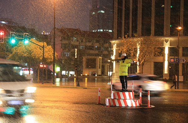 12月30日,元旦小长假第一天的下午,申城开始了新一轮的降雪。为确保城市安全运行和市民正常出行,最大限度减少降雨降雪和低温冰冻天气对道路交通的影响,上海公安机关立即启动冰雪天处置预案,指令全市公安各警种加大街面警力投放力度,强化应急保障措施。