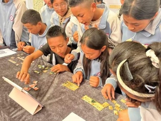 展览还精心设置了趣味互动环节。志愿者刘伟达巧妙设计了“时空拼图”名画解密挑战,精选展览中的经典画作,将其制作成拼图游戏。学生们分组合作,尝试还原《西园雅集图》、《桃花源图》等名作的细节片段。在游戏过程中,他们细致观察笔法特点、构图技巧和色彩运用,学会了如何捕捉艺术细节,深切感受中华书画的独特美学魅力。