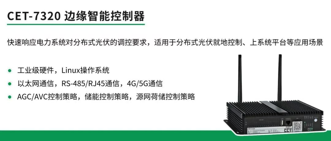 针对光伏发电并网可能带来的电压越限、功率因数降低和逆流等电能质量问题,CET中电技术部署了CET-7320边缘智能控制器。