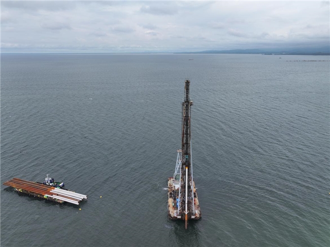 本项目主要建设内容包括新建1个40万吨级矿石泊位、1个25万吨级矿石泊位、1个7万吨级通用泊位、1个重件泊位及2个拖轮泊位,同步推进1座466米引桥、1座1120米引堤建设,以及东西侧围堰修筑与航道港池疏浚。其中,码头钢管桩设计共计554根,最长桩长达92.5米。此次打设的钢管桩为25万吨级泊位首根试验桩,桩长89.5米、直径1.2米、重量54吨。
