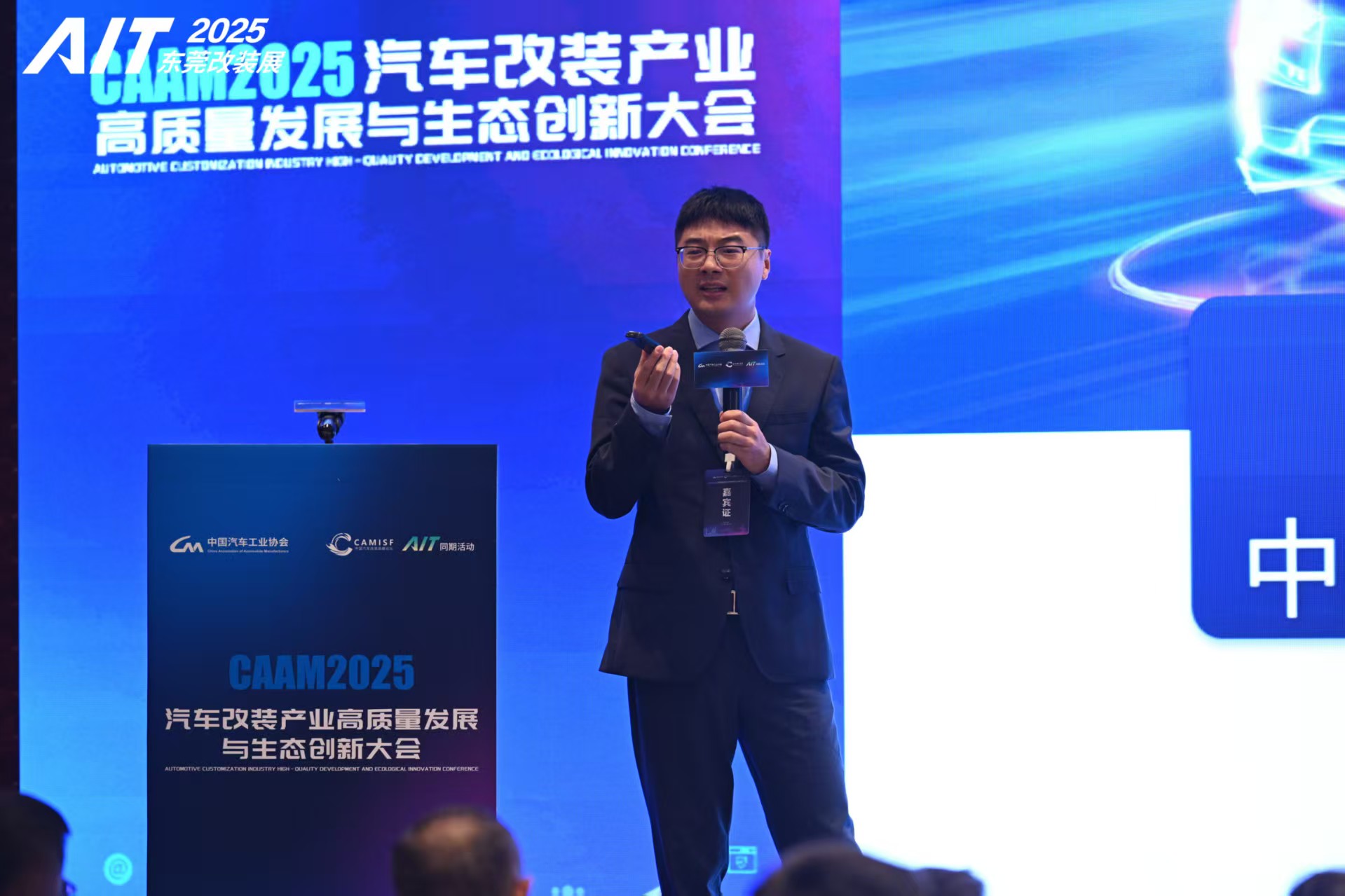 图:中国汽车工业协会汽车改装分会秘书长刘亚龙会上发言,呼吁业界携手拥抱智能化浪潮,共建规范、创新、共赢的产业新生态
