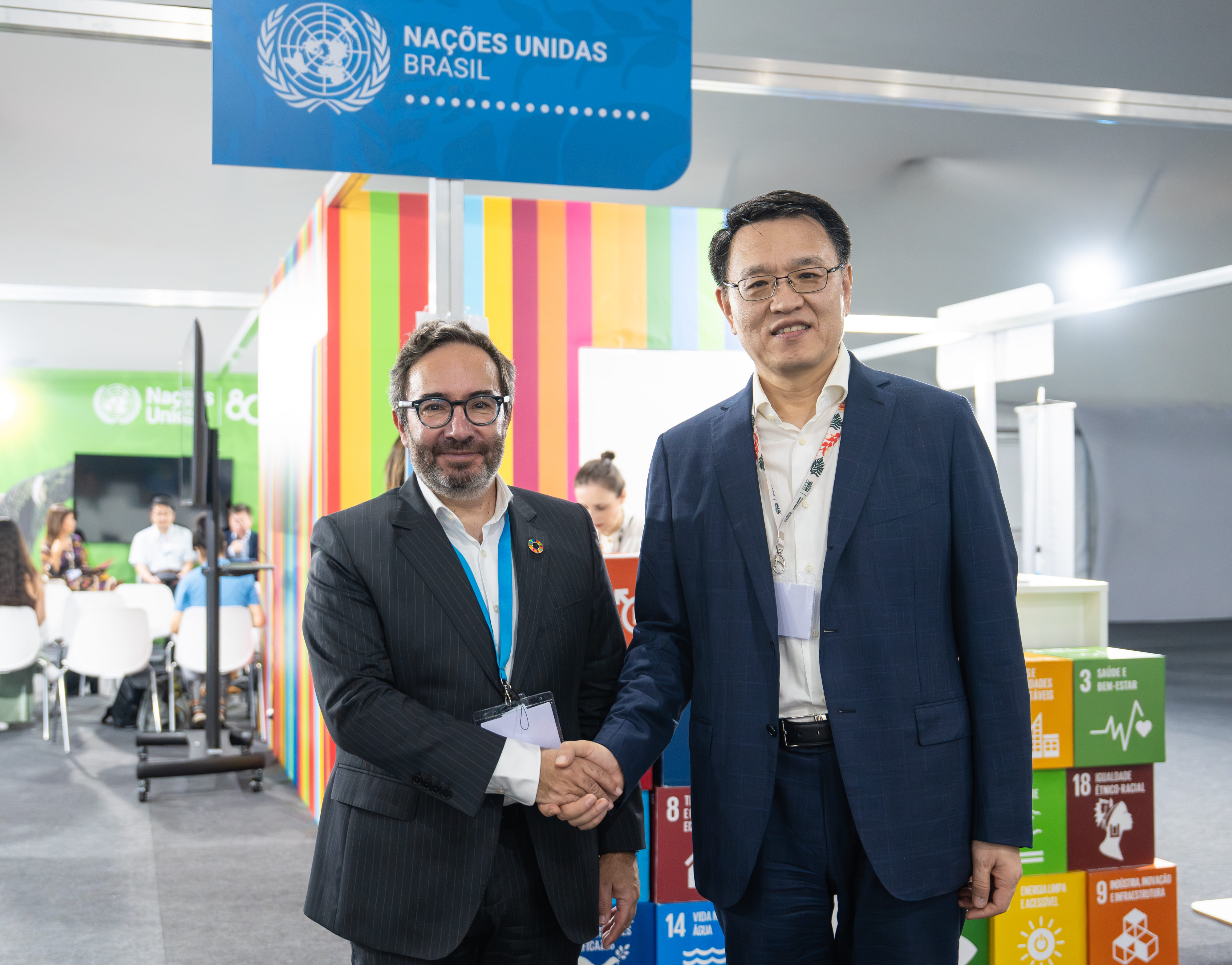 联合国副秘书长兼项目事务厅执行主任豪尔赫·莫雷拉·达席尔瓦(左)与“一带一路”绿色发展国际联盟理事长赵英民在“联合国角”会面。新华社记者 王天聪 摄