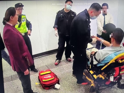 正在站厅巡视的值班站长孙喆接到乘客求助后,立即启动应急救援预案,一边用对讲机呼叫站内民警支援,一边迅速携带自动体外除颤器(AED)赶往现场。抵达时,民警已疏散围观乘客并开辟出安全区域,只见患病乘客脸色苍白、呼吸急促,正颤抖着自行服用随身携带的保心丸。工作人员当即蹲下身安抚乘客情绪,监测其生命体征,同时保持现场通风,避免二次风险。