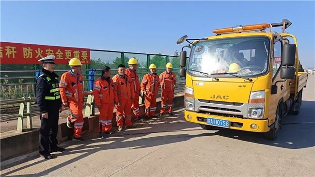 当日中午,中队长王训诚带领队员巡逻至桐香路高速上跨桥路段时,发现一辆装有警示灯的黄色道路维护车辆内人员密集,疑似超员。王训诚让驾驶员超越该车后,随车交警迅速下车,立即示意车辆靠边,停车接受检查。