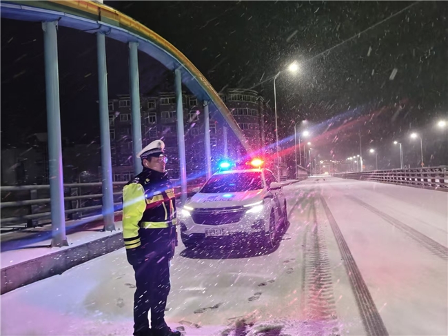 各公巡中队聚焦桥梁、坡道、弯道、临水临崖、低洼、高速入口等易滑易堵重点区域,构建“视频巡检+路面巡逻”立体化管控网络,安排人员24小时巡逻值守,实时掌握路面情况,并增加路面应急岗,充实执勤警力,及时处置突发状况。巡逻过程中,民警发现部分路段出现道路结冰现象后,立即与公路养护部门建立联动响应,快速对接撒盐融冰作业,最大限度降低路面结冰对通行安全的影响,全力保障道路通行条件。