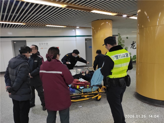 2026年1月26日下午13时45分,上海地铁7、12号线龙华中路站12号线一列往金海路方向的地铁列车到站后,一名男性乘客刚走出车厢便突发低血糖,身体晃悠着摔倒在站台上,脸色苍白、神情痛苦,情况颇为紧急。