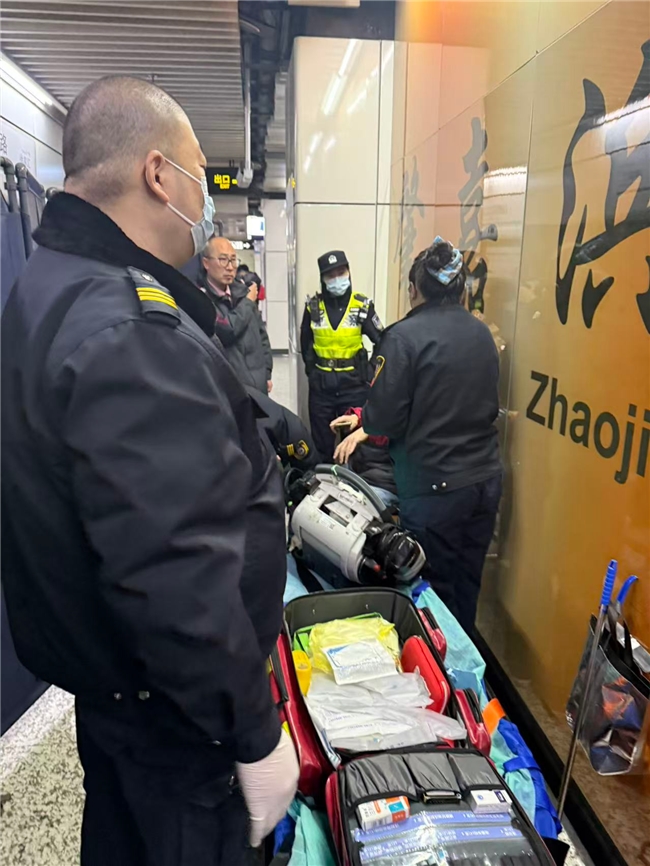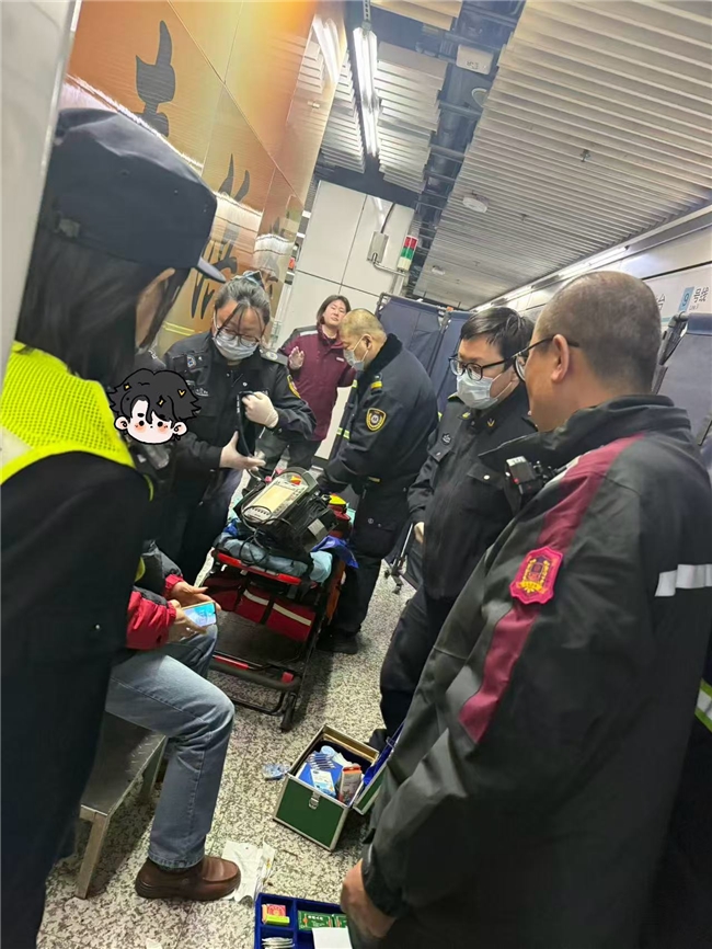 2026年1月24日11:00,刚完成日常巡视回到站长室的上海地铁9号线肇嘉浜路值班站长朱荣,对讲机里传来值班员的呼叫“站长,9号线上行列车车厢内有乘客拉手刹,反映车上有人晕倒,快去9号线站台”,听到汇报的值班站长朱荣夺门而出。9号线肇嘉浜路站台现场,晕倒的是一名70岁左右的老年男乘客,在2名站务员的搀扶下已经在站台上坐着休息,值班站长上前查看后发现乘客鼻子还在出血、鼻梁和嘴唇处都有破口,立即通知巡视岗站务员带好医药箱至现场;在与乘客交流过程中,发现乘客意识时而清醒时而迷糊,值班站长朱荣第一时间通知车控室拨打120,车站也及时准备了AED以防万一,同时车站值班员使用广播试图在车站范围内找到有医务资质的乘客。医药箱到位后,值班站长和站务员对乘客伤口进行了细致的清理,期间不断跟乘客讲话,保持乘客的意识清醒,车站民警也及时联系了乘客家属。