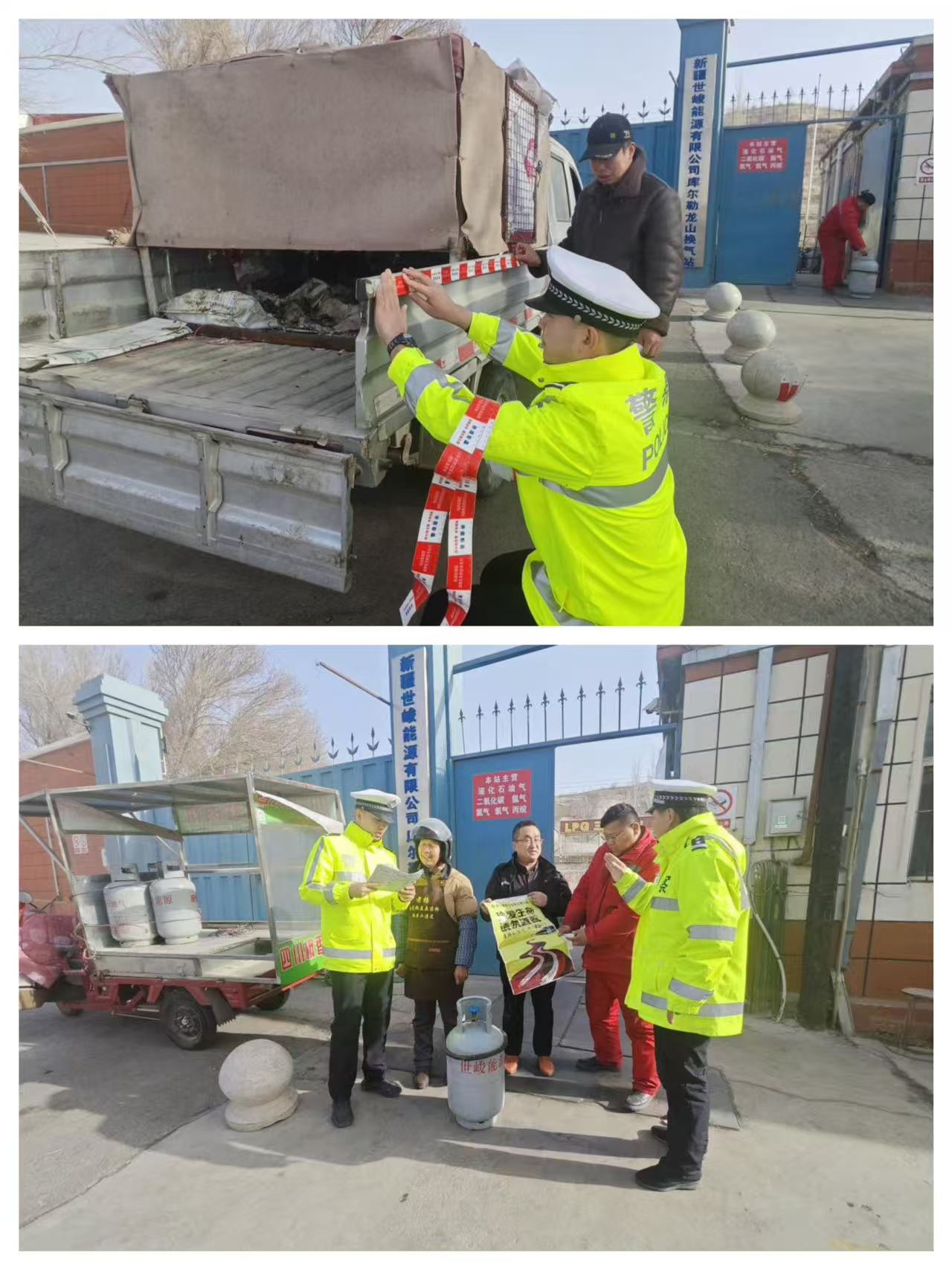 为从源头上消除液化气运输车辆途中交通安全隐患,精细做好防风险、保安全、护稳定、促发展各项工作,防范道路交通事故发生,为即将到来的马年春节营造良好的交通安全氛围。2月10日,库尔勒市公安局交通管理大队宣传中队组织民警深入到新疆世峻能源有限公司库尔勒龙山液化气换气站,为工作人员和换气驾驶人送安全送服务,为车辆免费赠送粘贴反光贴,警企联动筑平安,真正把交通安全各项举措落实落细。