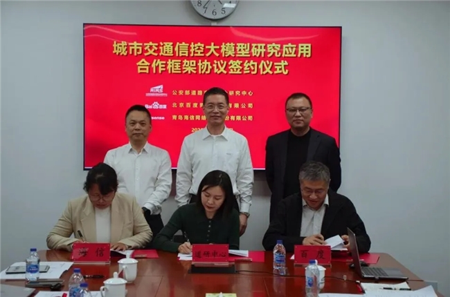 近日,公安部道路交通安全研究中心与北京百度网讯科技有限公司、青岛海信网络科技股份有限公司在北京举行城市交通信控大模型研究应用合作框架协议签约仪式,并对下步加快推进信控大模型研究应用开展深入研讨。道研中心王长君主任、戴帅副主任,百度石清华副总裁,海信网络科技张四海总裁等出席仪式。