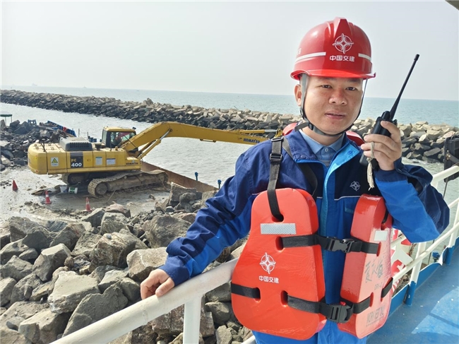 每天清晨的班前会上,他总会第一个来到甲板,给协作队伍反复叮嘱安全事项、交代当天任务。即便挖机已经顺利开始进行块石挖掘作业,他也从未闲下来。