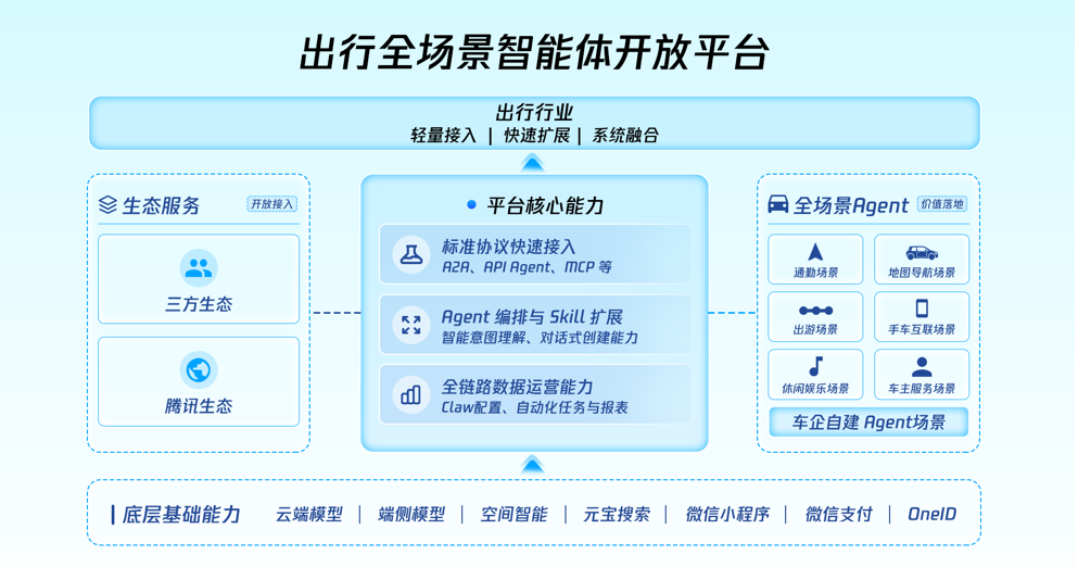 4月23日,北京车展前夕,腾讯举办2026 TIME DAY·腾讯智慧出行技术开放日,正式面向汽车行业发布“出行全场景智能体开放平台”,涵盖基础能力层、平台能力层及应用生态层,通过全栈能力加速智能体在企业场景应用落地。同时,基于智能体平台构建了随行点单、随行向导、随行逛逛等七大核心场景智能体,为用户提供更智能、个性化的座舱体验。