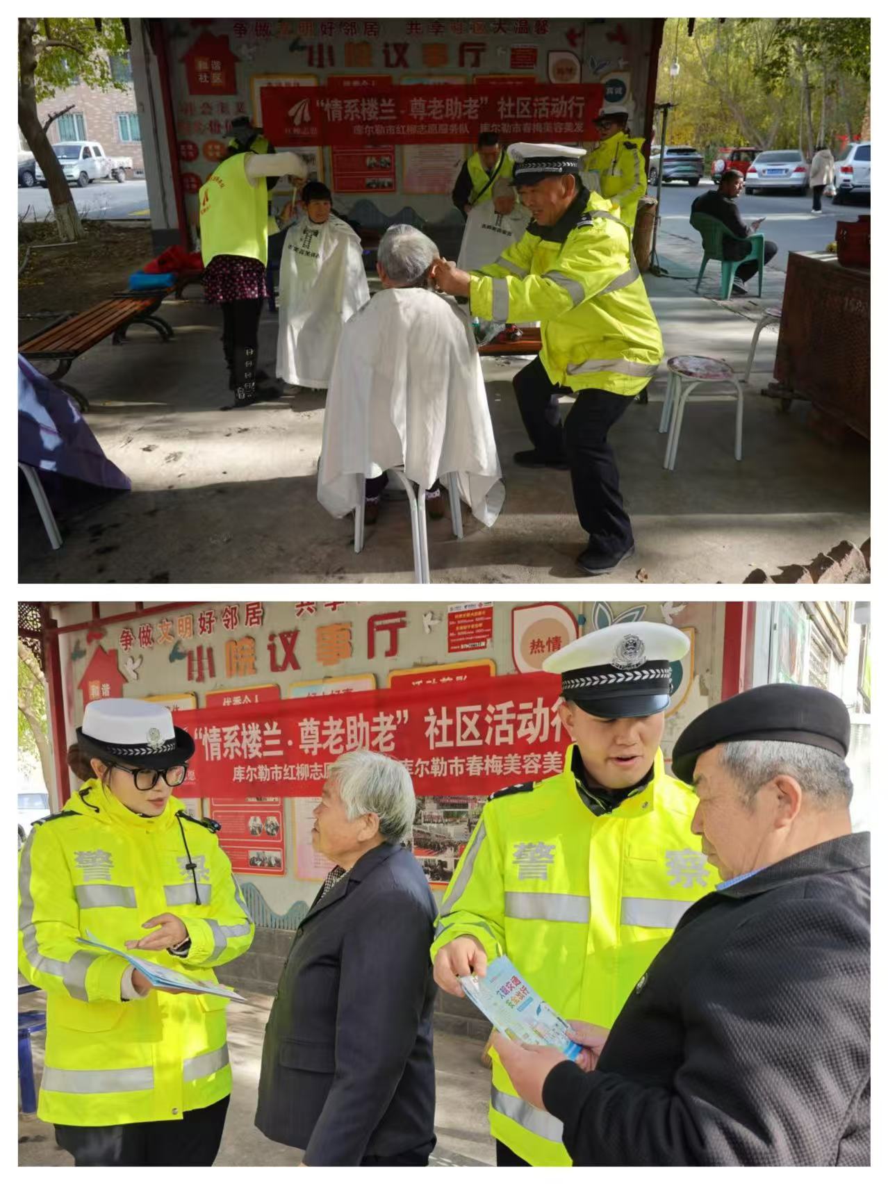 金秋送爽、岁岁重阳,爱满重阳、情暖桑榆。“荧光绿”用行动,守护最美“夕阳红”。在重阳节来临之际,为弘扬中华民族尊老敬老的传统美德,营造尊老、爱老、助老的社会氛围,进一步提高老年人交通安全意识、文明出行意识和自我防护能力,把“知危险会避险、安全文明出行”真正落到实处,预防和减少涉及老年人的交通事故发生。10月27日,新疆库尔勒市公安局交通管理大队文明交通志愿者服务队与库尔勒市红柳志愿者服务队深入到库尔勒市建设街道上恰其社区,共同参加社区举办的“情暖重阳·爱满邻里”主题活动,警民志愿者为老年人送服务、送祝福、送安全,除开展义务理发外,还送上了精心准备的交通安全“大礼包”,给老年人带来了稳稳的幸福感和满满的安全感。