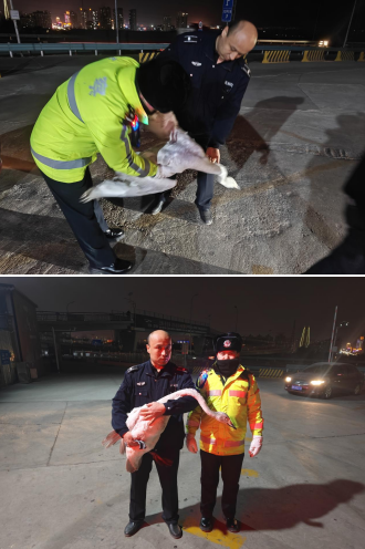 1月19日20时45分,新疆库尔勒市公安局交通管理大队天山路中队执勤交警希尔艾力·阿卜来提、左金磊在晚高峰执勤时,接到大队指挥中心派警指令称,龙山转盘处发生了一起轻微交通事故,他们立即赶到现场。处理完这起剐蹭交通事故时,意外发现道路旁的绿化带内有一只天鹅正在扑腾,他们立即展开了施救。