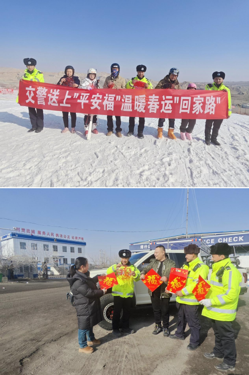 2月2日为期40天的2026年春运大幕开启。2月2日,新疆维吾尔自治区库尔勒市公安局交通管理大队塔什店中队组织执勤交警在G216线春运服务站、流动执勤点和辖区热门滑雪场——库尔勒市塔什店镇回水湾红光滑雪场等车流、人流密集处开展“平安春运交通同行”主题宣传的同时,还集中开展送安全、送服务、送祝福活动,将购买的上百个“平安福”送给广大驾乘人员,用行动温暖了春运“回家路”。