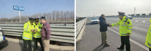2月3日上午,潍坊市交通运输综合执法支队明董高速大队执法人员苏林、吴海波、李忠诚沿青银高速执法巡查时,发现一辆白色轿车异常停靠在应急车道,车旁一名外籍友人正四处张望、神情焦急。考虑到高速应急车道停留的安全隐患,执法人员立即靠边停车上前处置,主动用英语耐心询问情况。
