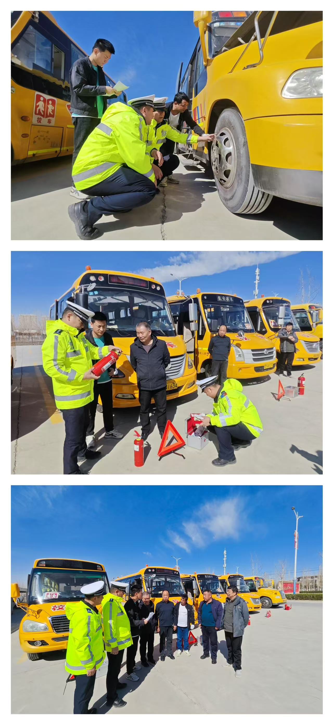 库尔勒市公安局交通管理大队民警辅警与库尔勒市教育局工作人员将全市校车集中在一起,对校车驾驶人资质、年度审验、行车线路等基本情况进行认真检查、核对、登记,对全市校车的轮胎、制动、警示灯、指示牌、监控、灭火器、外观标识、停车指示标志、安全带、逃生锤、急救箱、应急安全门等进行检查,要求各学校和幼儿园完善校车信息台账,建立一车一档,严防“带病”校车上路行驶、接送学生和幼儿。