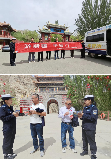 为拧紧旅游“安全阀”,护航旅客平安路, 有效减少旅游旺季交通违法、预防旅游车辆交通事故发生,向广大游客传递文明旅游、安全出行理念,库尔勒市车管所民警辅警还成为广大游客的“活地图”、“贴心人”,深入扎实开展“游新疆 平安行”主题宣传,宣传库尔勒以及巴州著名的旅游景区景点分布情况,推荐库尔勒人气最为火爆的美食城、农家乐、酒店、宾馆以及直达路线、易堵时间、绕行路段等,宣传即将到来的“五一”假期旅游旺季安全出行“两公布一提示”,不厌其烦地向游客宣传酒后驾驶、分心驾驶、疲劳驾驶、超速行驶、不系安全带等交通违法的危害性。“流动车管所”还变成“顺风车”免费护送游客到景区停车场,进一步提升了游客的安全感和满意度,让游客“乘兴而来、安全而归、愿意再来”,力争让旅游的“流量”真正变成游客的“留量”,确保广大游客玩得开心、游得满意、行得安全,全力护航旅游经济高质量发展,为“五一”假期全力营造了平安、稳定、有序的旅游道路交通环境。