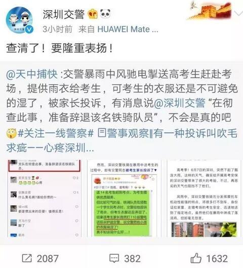 6月7日,有网友爆料称,深圳一交警暴雨中送高考生赶赴考场并提供雨衣,可考生衣服还是湿了,反被家长投诉。另外有一置顶留言说:“深圳交警在彻查此事,准备辞退该名铁骑队员”。6月8日一早,深圳交警官方微博回应:“查清了!要隆重表扬!”