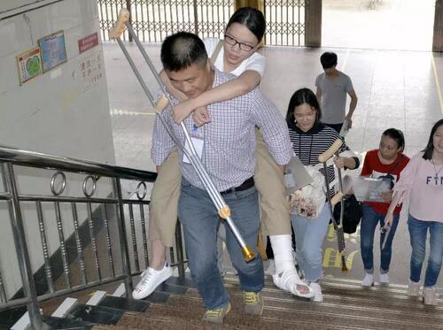 ▲6月7日,在湖南省某考点,考场工作人员背起左脚骨折的考生,将她送到二楼考场