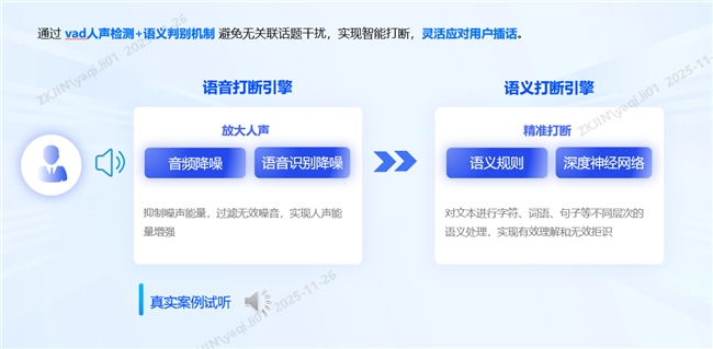 “ 接得住 ” ,插话响应超灵敏,交互自然如真人 :通过VAD人声检测与语义判别双引擎协同,智能体可在1.8秒内灵敏捕捉客户插话并即时响应,自动中断当前播报,优先解答疑问。这种“随时接话”的交互模式,模拟真人销售的沟通体验,大幅降低客户沟通障碍。