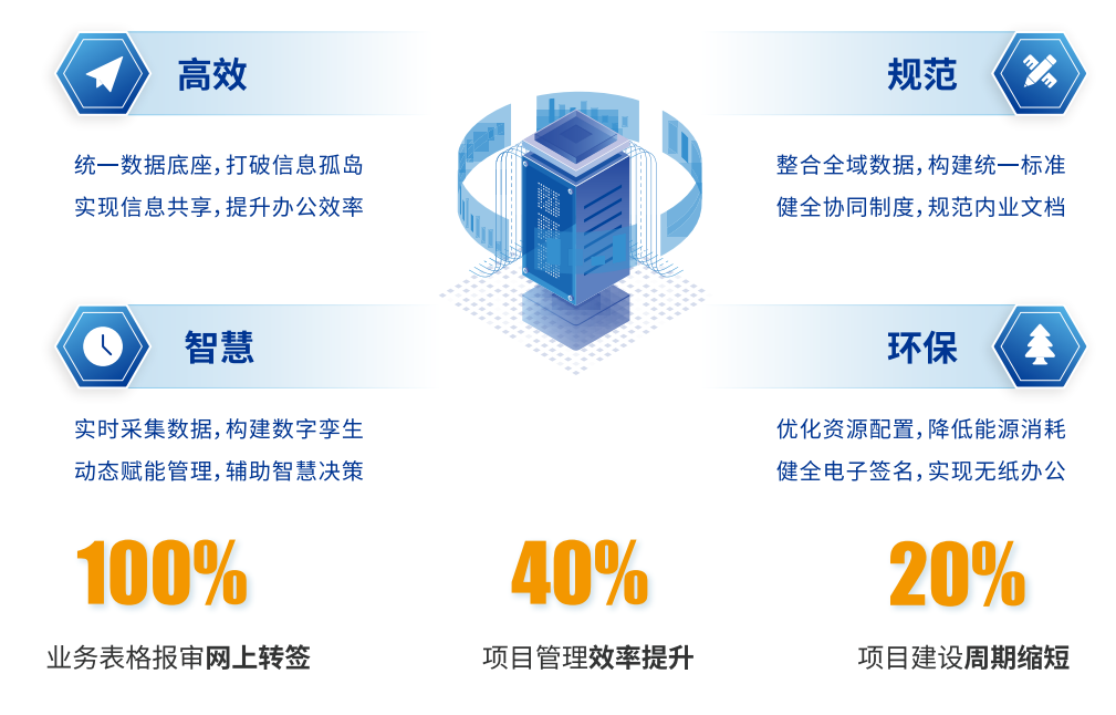 创新实现“系统应用一体化、施工现场可视化、数据呈现图形化、项目管理移动化”的全新管理模式,提高项目管理效能。