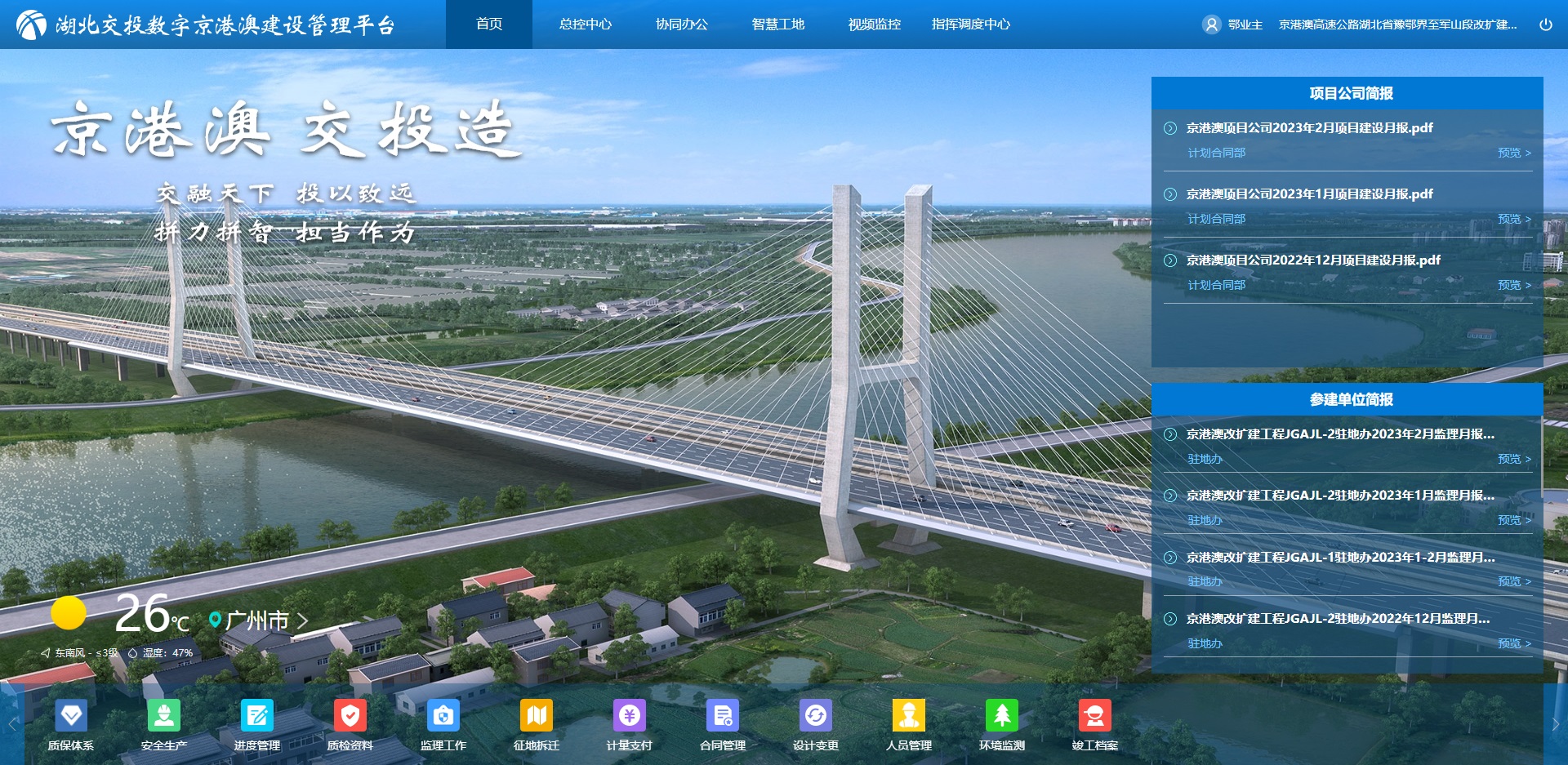 湖北交投数字京港澳建设管理平台基于BIM技术,深度融合GIS、移动互联网、物联网、大数据、云计算等技术,紧贴施工现场需求,以工程建设阶段的施工管理数字化为核心,实现施工过程信息化,为建设单位、监理单位和施工单位提供协同管理平台。