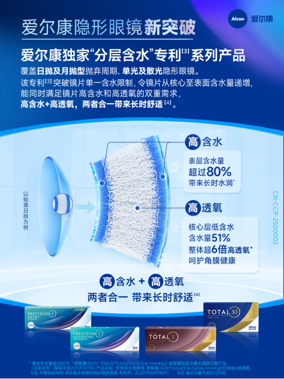在隐形眼镜选择中,含水量与透氧性的平衡始终是核心难题。不少用户陷入“高含水初期舒适但易眼干,低含水透氧不足”的两难,而爱尔康独家“分层含水”专利技术1的问世,为这一行业痛点提供了系统性解决方案。