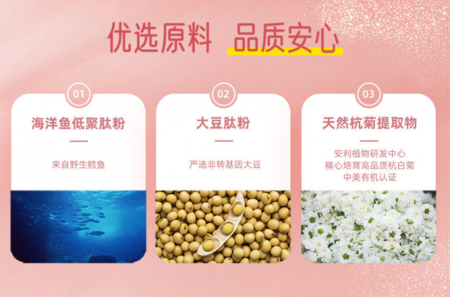 核心配方:动植物双肽+有机杭菊,针对性解决痛点 :区别于单一鱼胶原或植物胶原产品,纽崔莱采用天然原料萃取双肽,海洋鱼低聚肽粉+大豆肽粉结合,小分子活性肽含量充足,满足人体高效吸收需求;添加有机杭菊提取物,增强抗氧化活性,专门针对黄褐斑困扰,同时实现皮肤抗氧化、延缓衰老的功效,精准适配中老年人的保养需求。