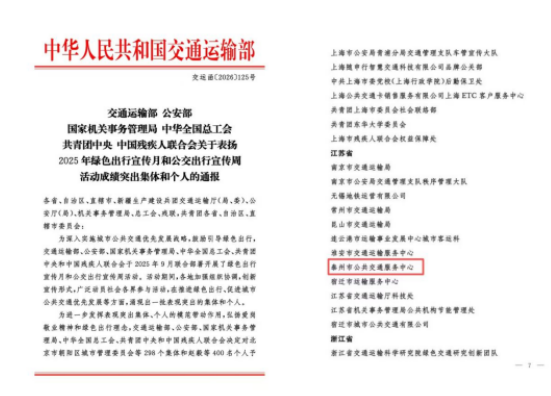 日前,交通运输部、公安部、国家机关事务管理局等六部门联合发布《关于表扬2025年绿色出行宣传月和公交出行宣传周活动成绩突出集体和个人的通报》,泰州市公共交通服务中心获评“2025年绿色出行宣传月和公交出行宣传周活动成绩突出集体名单”。这份国家级荣誉,是对中心践行绿色出行、深耕公交优先的一份温暖回响和高度肯定。