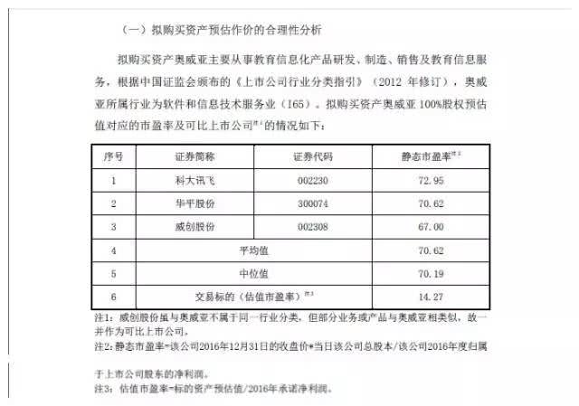 而市盈率方面,三爱富在《三次修订稿》中也着重强调了收购的合理性。从上表可以看出,可比上市公司市盈率平均值、中位值分别为70.62 倍、70.19 倍,本次交易拟购买资产奥威亚100%股权估值市盈率为14.27 倍,三爱富方面称“显着低于同行业平均水平”。