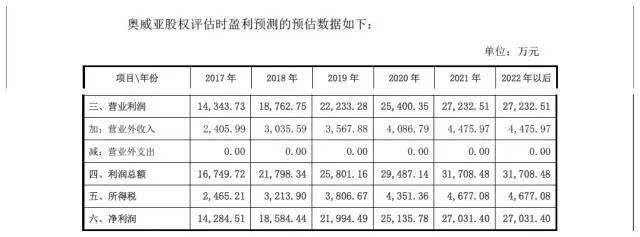 在三爱富对奥威亚作股权评估时,对其盈利的预测如上图所示。其中2016年的对赌业绩已完成,且超出1264.2万元;而2017、2018年,三爱富所订立的对赌业绩也仅仅略高于它对奥威亚的盈利预测。由此看来,奥威亚完成业绩对赌相对轻松。