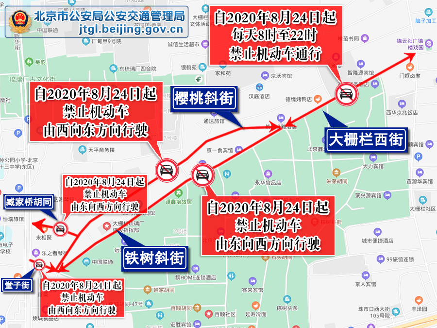 通告称,为保证西城区大栅栏地区的交通安全与畅通,根据道路交通安全法律法规的有关规定,决定自2020年8月24日起,对大栅栏地区部分道路采取以下交通管理措施: